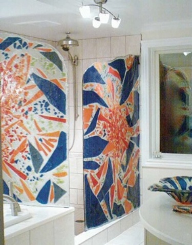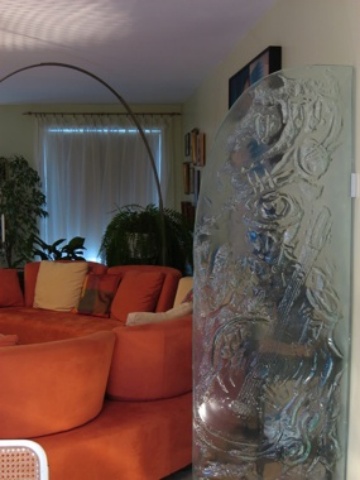 - Créations de murs de verre fusion (thermoformage) avec empreintes , textures en verre clair et en verre de couleurs, Tables de salons, table à manger, comptoirs, éviers, douches.